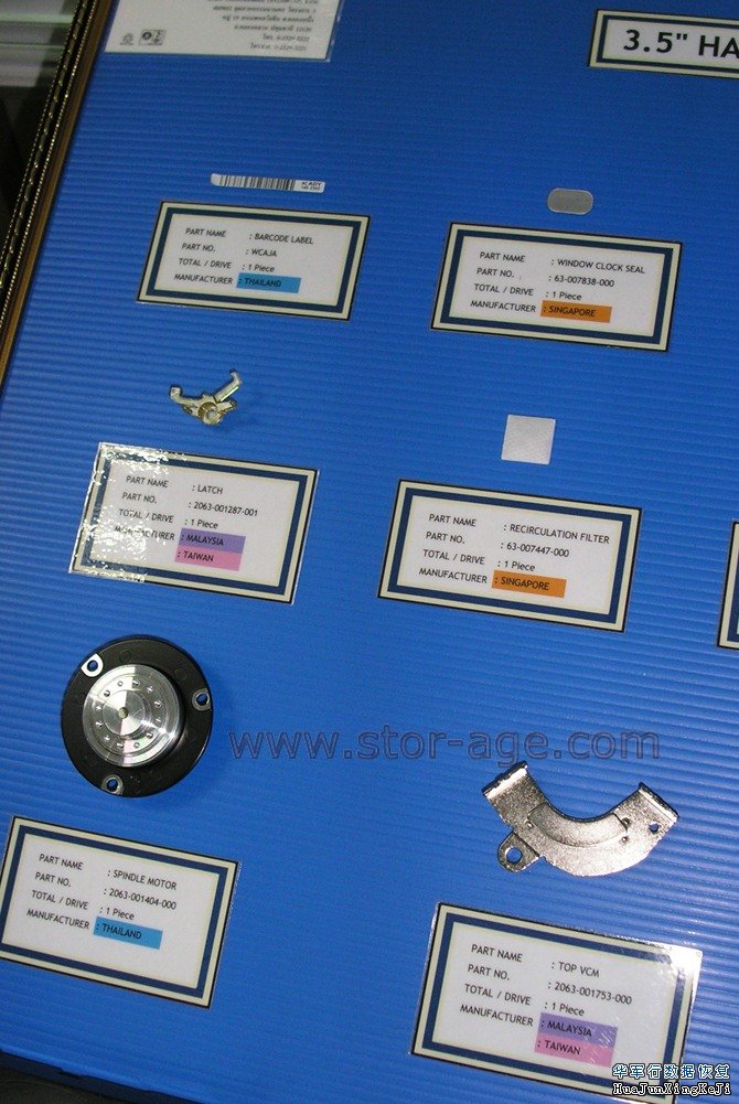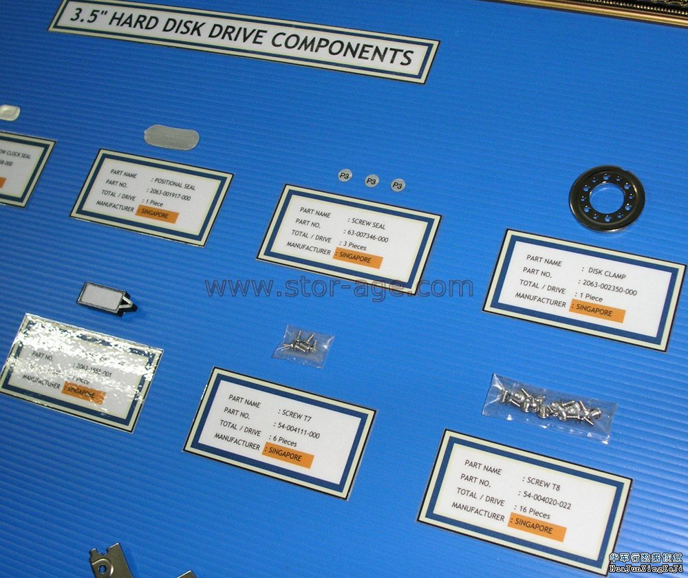 3.5英寸硬盘部件全景图:每种部件下面的标签都注明了其名称、数量和产地,不同的产地还加以颜色区分