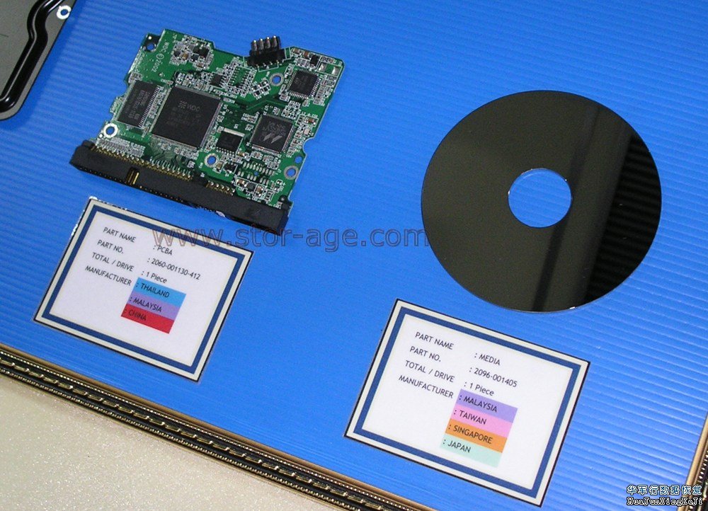 右面就是PCBA(Printed Circuit Board Assembly,印刷电路板组件)和盘片了。PCBA有时会被简略地称为硬盘的“电路板”,它与HDA(Head-Disk Assembly,磁头磁盘总成——此处之所以没有用“组件”,主要是考虑到还包括有主轴马达、VCM和外壳,换个表达方式或许更为确切)共同构成一台完整的硬盘驱动器。盘片这里只摆出了一张,大家知道可以有更多就是了。