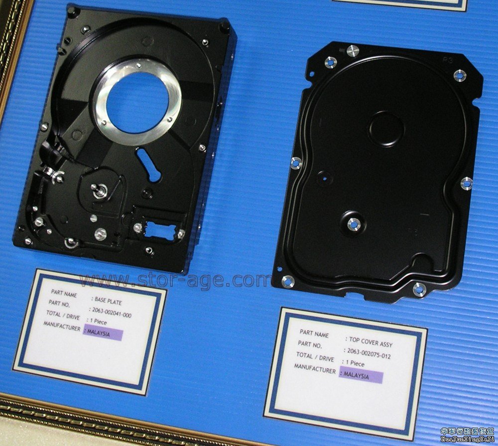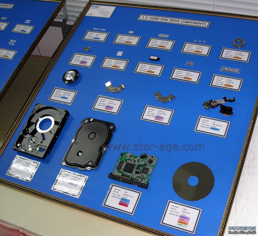 看过了“坦诚相见”的硬盘驱动器,对于其各组成部件一定很有兴趣吧?现在的WD宣传上的确很动心思,布置了专用的展板,供我们观赏组成硬盘(驱动器)的各个部件。WD的这款3.5英寸硬盘共有18种部件,其他的3.5英寸硬盘可能在部件的种类上有所区别,但显然是大同小异。至于部件的数量,底托、顶盖、主轴马达、HSA、PCBA等一部硬盘驱动器只有1个,盘片会有一个或多个,而螺钉肯定就要上两位数了。