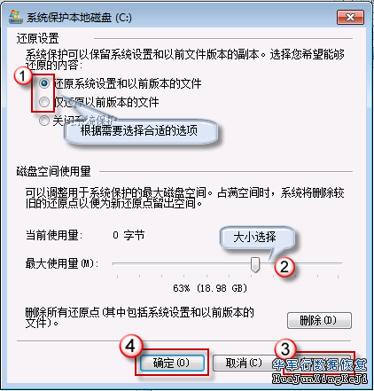 选择合适的还原设置(如果非系统盘,选择“仅还原以前版本的文件”即可),磁盘空间大小,然后依次按“应用”,“确定”退出