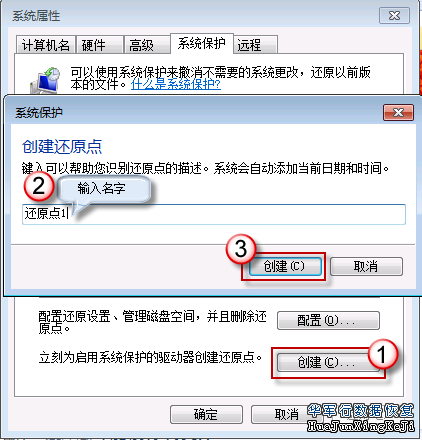 最后,再为还原点设个标识。按" 创建",在还原点创建框内输入名称,可以是创建时间,也可以是其它您喜欢的内容,反正尽可自由发挥啦。完成后,再按“创建”