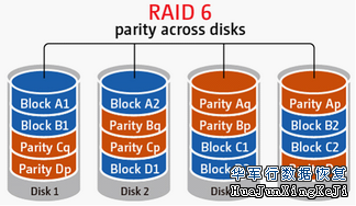 RAID6 全称Independent Data disks with two independent distributed parity schemes (独立的数据硬盘与两个独立分布式校方案)RAID 6 等级是在RAID 5 基础上,为了进一步加强数据保护而设计的一种RAID 方式,实际上是一种扩展RAID 5 等级。与RAID 5 的不同之处于除了每个硬盘上都有同级数据XOR 校验区外,还有一个针对每个数据块的XOR 校验区。当然,当前盘数据块的校验数据不可能存在当前盘而是交错存储的。这样一来,等于每个数据块有了两个校验保护屏障(一个分层校验,一个是总体校验),因此RAID 6 的数据冗余性能相当好。但是,由于增加了一个校验,所以写入的效率较RAID 5 还差,而且控制系统的设计也更为复杂,第二块的校验区也减少了有效存储空间。