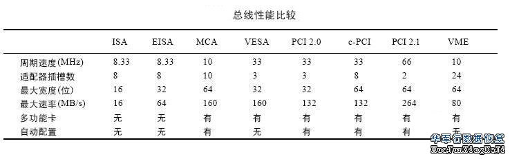 表中给出了上述讨论的总线技术的简单的比较。PCI总线占有三列,它们分别表示:版本2.0,这是当前机器上安装的主要版本;版本2.1,这是1999年广泛实现的版本;c-PCI版本。