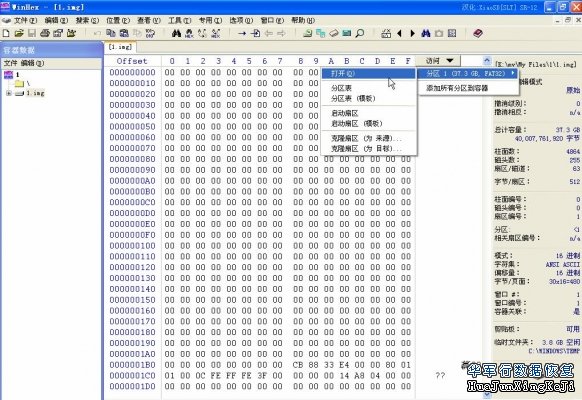 接着再次点击“容器数据”窗口内的“文件”,在弹出的下拉框中选择“添加映像”,即可将映象加入到容器中,WINHEX已经直接将镜象解释为磁盘,图8: