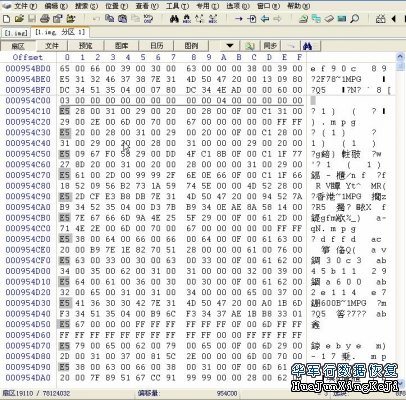 很明显,提示中所列出的偏移处的值均是不正常的,现在先转到第一个错误的偏移954C00H处,可以选择“位置――转到偏移量”,在弹出的“转到偏移量”对话框内输入“954C00”,跳转到这个偏移处,如图10: