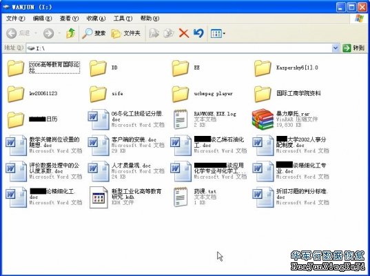 回头看一下图9的错误列表,发现所有的错误偏移都在这8个扇区的范围内。而由DBR信息得知根目录为19102扇区开始的64个扇区,这8个扇区确实处在根目录内,这就是根目录下的文件和目录乱码的原因。 将19110号扇区~19117号扇区这8个扇区除前16字节以外的其他内容复制并写入19110号扇区起始偏移处,也就是向前提16个字节,恢复其原来面目。 保存更改后,用虚拟磁盘软件加载后,所有根目录内容恢复正常。如图12(图中有关私人或单位信息做了隐藏处理):