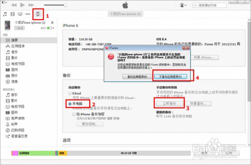 打开iTunes软件,然后将手机用数据线与电脑进行连接。连接成功后,在窗口左上角有一个手机小图标,该图标较小,请仔细找找,如下图中红框1处所示即为代表您手机的小图标。我们点击该小图标,然后选择“本电脑”,再点击“立即备份”,为了减少备份所花的时间,再在弹出窗口上点击“不备份应用程序”,即依次点击下图中的1,2,3,4。