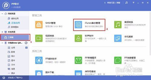 打开“PP助手”软件,然后点击“工具箱”->“iTunes备份管理”。