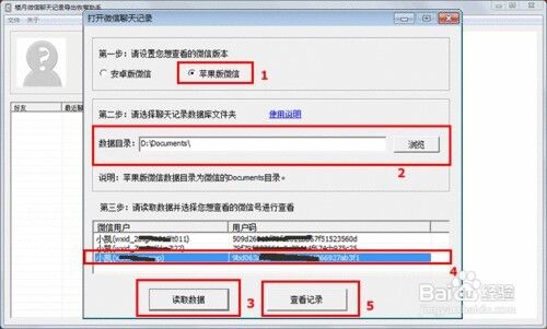 打开“楼月微信聊天记录导出恢复助手”软件,设置为“苹果版微信”,然后将数据目录设置为我们刚才导出来的Documents文件夹。然后点击“读取数据”按钮,该手机上所有登陆过的微信号码就会显示在列表框里,此时我们可以选择一个想查看的微信号码,再点击“查看记录”按钮。