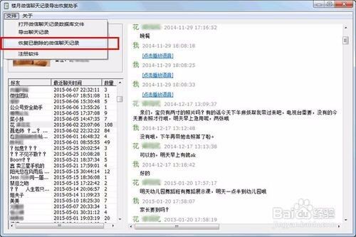 此时,所有未删除的微信聊天记录就全部显示在软件界面上了。我们再点击“文件”,“恢复已删除的微信聊天记录”。