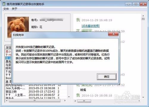 稍等几秒后,微信删除的聊天记录就被成功恢复了,软件将弹出窗口提示成功恢复的微信记录条数。如下图所示: