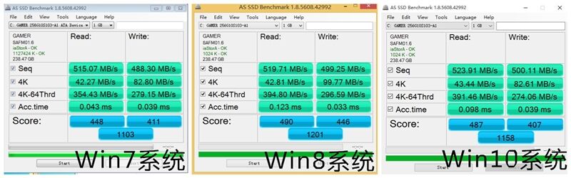 Windows 8 4K随机写入较好,Windows 10 4K随机写入又突出,QD 32 4K性能则是Windows 8十分突出,但总的来说二者差别也不是很大,Windows 7就略弱一些了。