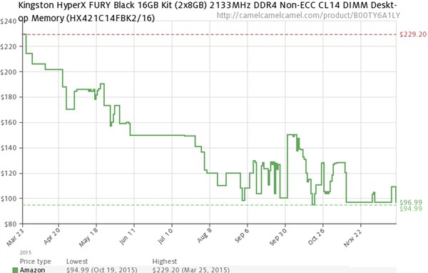 美国亚马逊上,金士顿HyperX Fury Black 2×8GB DDR4-2133今年3月卖229.20美元,现在只要108.99美元,降低了52%