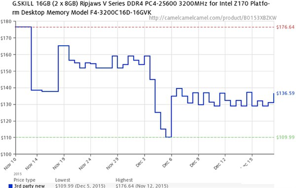 芝奇Ripjaws V 2×8GB DDR4-3200 11月初上市时要176.64美元,现在迅速降到了136.59美元,幅度有23%。