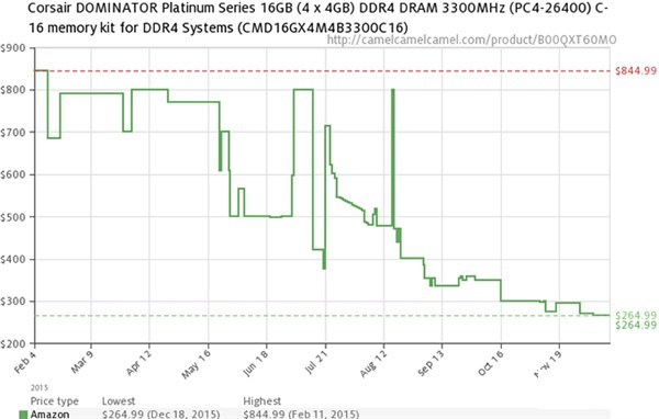 4×4GB DDR4-3300更是从年初的844.99美元来到了264.99美元,降幅几乎70%,特别是下半年简直疯了!