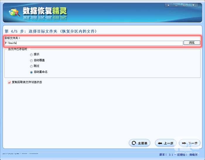 将U盘中,需要恢复的文件与目录勾选完毕后,点击“下一步”按钮,将这些文件与目录拷贝出来,数据恢复精灵会弹出如下窗口,你可设定恢复文件与目录的目标文件夹: