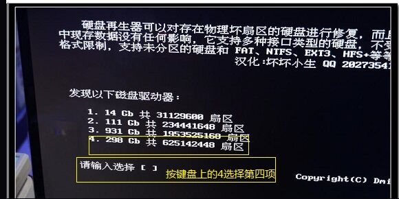如上图,此时该工具会检测到连接在电脑中所有的存储设备,其中第一项为14G容量,很明显是笔者的16G U盘设备,还有其他的为笔者电脑中的硬盘。这里选择的时候,主要是根据硬盘容量来选择到底属于那块硬盘,由于笔者电脑连接了几块硬盘,故障不能用的硬盘是320G的,很明显可以看出是第四项。(如果大家不方便区别,不妨关闭电脑,将好的硬盘都断开连接,仅留下故障硬盘和U盘插入电脑即可,这样就非常好分辨了。