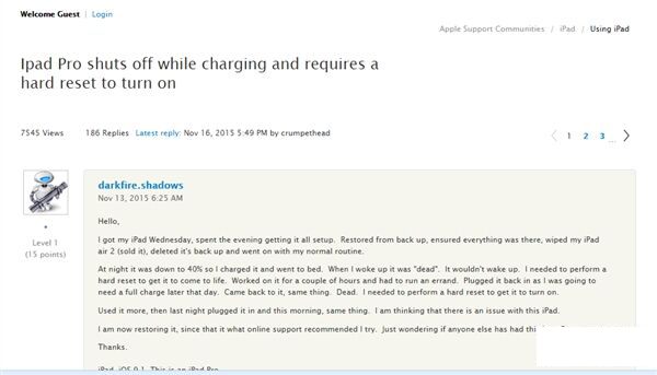 从用户的描述看,问题基本上是,iPad Pro在使用过程中莫名其妙的出现无法唤醒现象,目前能解决的方法是,同时按下Home键和电源键强制重启。