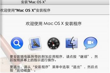 第一步:抹掉您的启动磁盘1.将 Mac OS X Install DVD 插入光盘驱动器并重新启动电脑。
