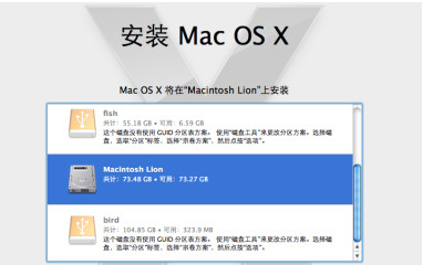 9.磁盘被抹掉后,从磁盘工具菜单中选取退出磁盘工具。将返回“安装 Mac OSX”屏幕;详情请看“第二步:安装Snow Leopard操作系统”。