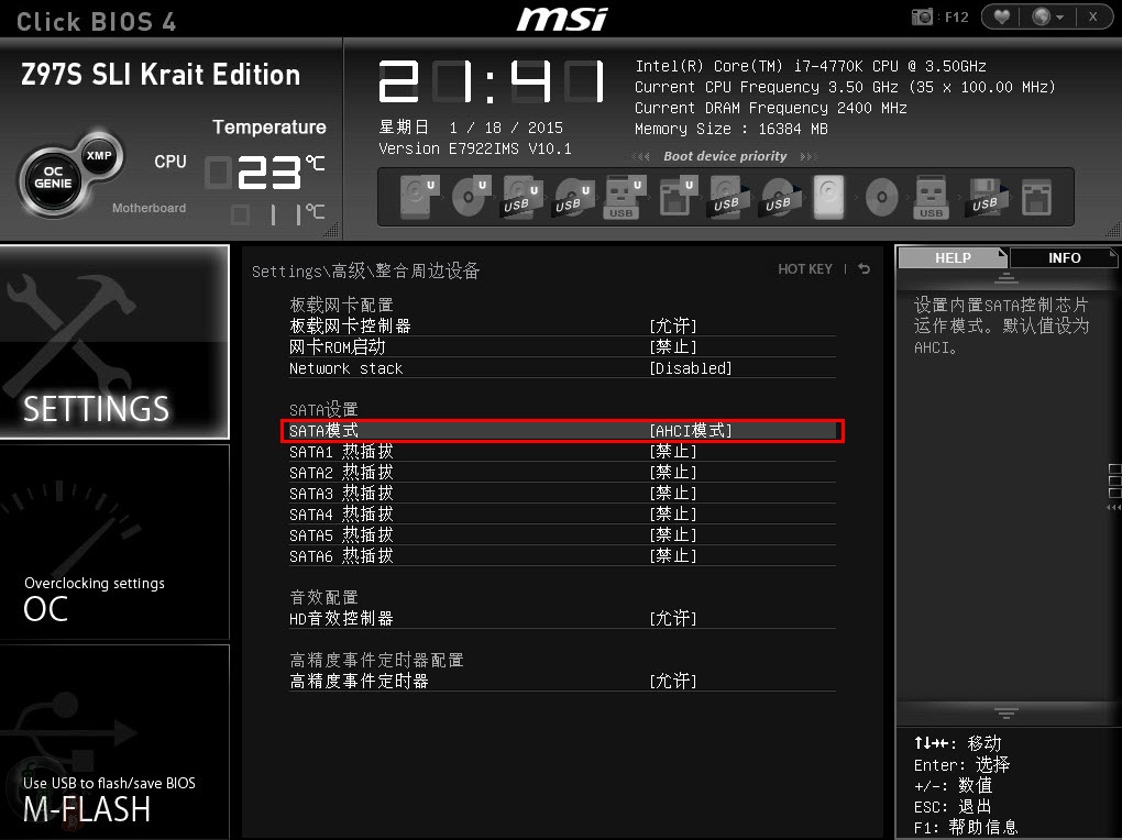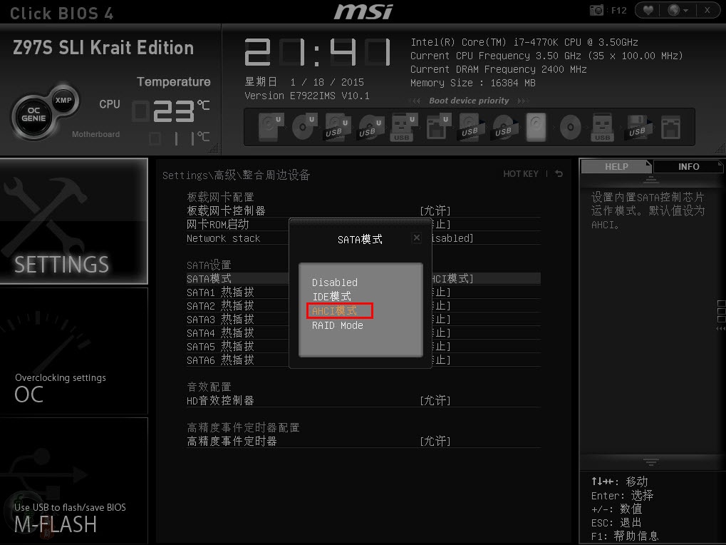 “Start”键值更改完成后,重启电脑,把BIOS里设置硬盘模式改为AHCI,然后再重启电脑,进入操作系统。