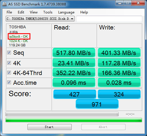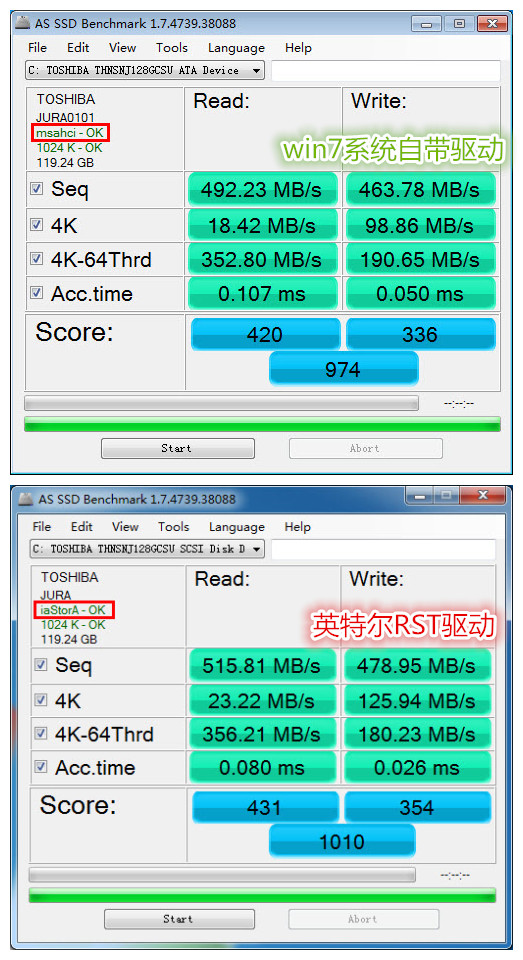 AS SSD Benchmark软件红框中的“msahci”字样,代表着驱动为win7操作系统自带驱动。红框中的“iaStorA”字样,代表着驱动为英特尔RST驱动。使用英特尔RST驱动后,东芝DTS312 128G SSD的性能提升很明显,整体表现要远好于使用win7系统自带驱动。这说明东芝DTS312 128G SSD更加适合用英特尔RST驱动。(一般来说多数SSD更换英特尔RST驱动后,都能提升性能。但少数SSD,使用英特尔RST驱动后,性能则会降低。所以要选择自己SSD适合的驱动才行。)