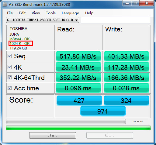 如何查看你的SSD是否4K对齐?一般可以使用AS SSD Benchmark这款软件来查看,如上图红框所示,如果在1024,2048之类的数字后面带有“OK”的字样,说明SSD已经4K对齐。如果没有“OK”的字样,说明4K没有对齐。如果“OK”前面的数字非常的大,并不是1024,2048之类的数字,则说明在安装操作系统时,硬盘划分了隐藏分区。在安装时win7系统,会自动生成100M的隐藏分区。在安装时win8系统,会自动生成350M的隐藏分区。只要不保留C盘之前的硬盘隐藏分区,那么“OK”前面就会显示1024,2048之类的数字。保留的话,那“OK”前面的数字就会变得很大。