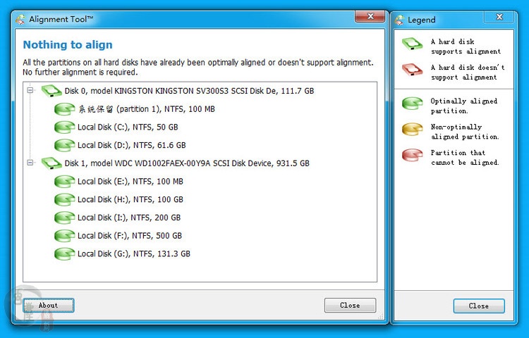 左侧是你的硬盘,而右侧,则是说明,如果显示绿色,则是已经对齐4K,而显示黄色,则是可以对齐4K,但未对齐,而粉红色的,则是不支持高级格式化,也就是对齐4K也没用。选择黄色未对齐的硬盘,勾选上,然后点下面的Align Partitons即可。