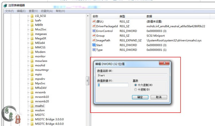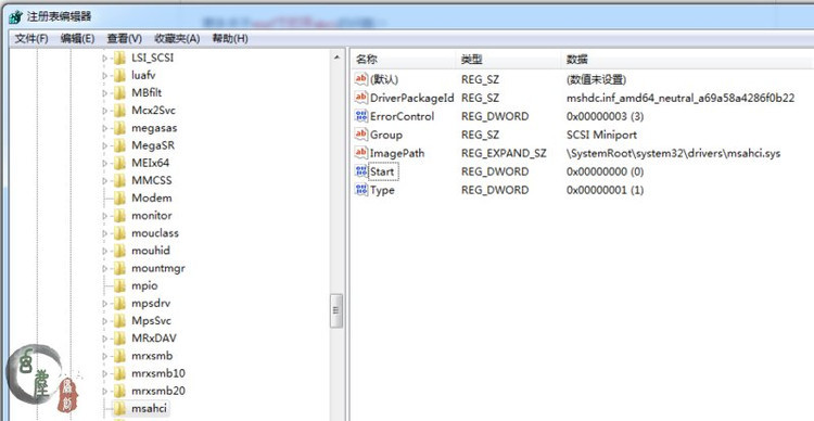 先用IDE模式正常进入系统,然后打开注册表,将“HKLM\System\CurrentControlSet\Services\MSahci”下的“Start”键值改为“0”(默认应该是3)。然后再重启,在BIOS里设置硬盘模式为AHCI,就可以正常进入桌面了。