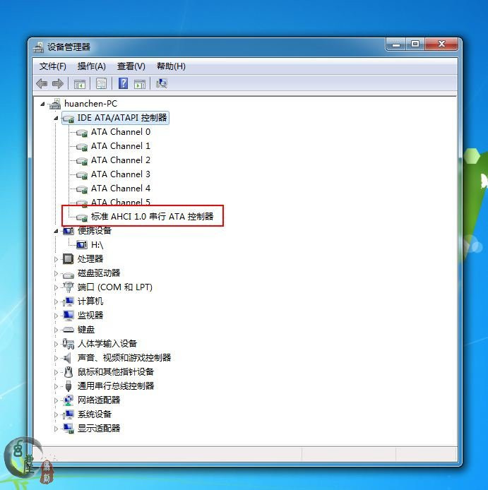 电脑重启后,打开设备管理器,在IDE ATA/ATAPI控制器项中,会看到“标准 AHCI1.0串行ATA控制器”这个选项,这就说明AHCI模式已经打开。