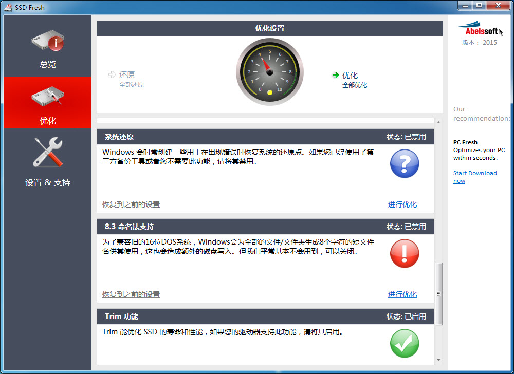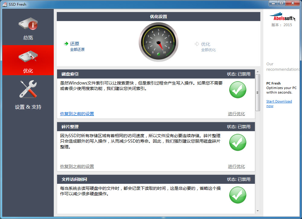 SSD硬盘擦写寿命有限,如按机械硬盘的设置方法,开启系统还原,使用碎片整理之类的,会很伤SSD硬盘。所以要禁用不必要的操作系统功能。但是一个一个手动禁用会很麻烦,所以使用一些优化软件,就会省事不少。例如这款名为SSD Fresh ssd硬盘寿命优化软件,就挺实用的。 这里向大家推荐一下。