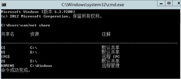 首先是要检查电脑是否设置网络共享文件,方法很简单,开始-运行-cmd,然后回车,在dos命令下面输入:net share 即可,如下图所示: