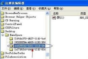 ⑵如上图,然后依次展开位置:HEKEY——LOCAL——MACHIME/SOFTWARE/microsoft/WINDOWS/ CURRENTVERSION/EXPLORER/DESKTOP/NAMESPACE 在左边空白外点击“新建”,选择:“主键”,把它命名为“645FFO40——5081——101B——9F08——00AA002F954E”如下图: