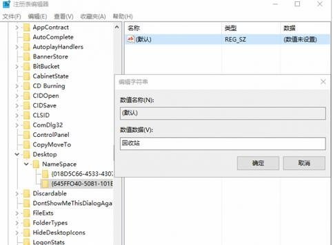 Win+R后输入regedit进入注册表,直接定位到 HKEY_CURRENT_USER\SOFTWARE\Microsoft\Windows\CurrentVersion\Explorer\DeskTop\NameSpace 在右侧点击鼠标右键新建“项”,将其重命名为: {645FFO40——5081——101B——9F08——00AA002F954E} 随后双击右侧的“默认”项,将数值数据修改为“回收站”,