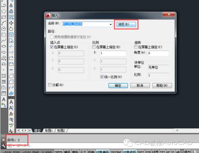 输入快捷键i然后在插入块的对话框中选择“浏览”