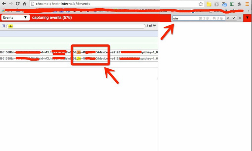 言归正传,下面开始介绍uin的获取方法: 1、登录微信网页版(推荐使用chrome浏览器,因为下一步是针对chrome浏览器的) 2、开始chrome浏览器内置的抓包模式,即在新建的标签页地址栏中输入:chrome://net-internals/#events 3、在微信中进行一些聊天操作,然后在浏览器的层级上搜索(ctrl+f)“uin”,不出意外可以搜到一个9位的uin码,这个就是你微信号对应的uin码