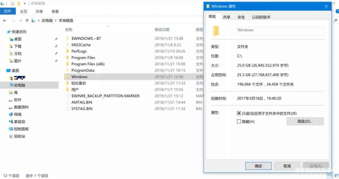 Windows文件夹,这里边几乎存放了Windows系统运行所需的所有内容,我们查看文件夹属性会发现它比较大,而且按照我们使用的情况来看,它会越来越大。