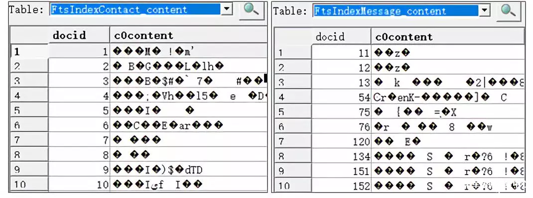 收藏内容(FtsIndexFavorite_content)、通讯录内容(FtsIndexContent_content)、消息的容(FtsIndexMessage_content)等表项中内容字段均为密文,如下图所示(乱码的即为密文):