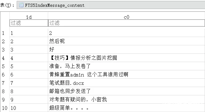 图中加密字段的解密秘钥为IMEI与uin组合后的MD5值,因此很容易解析出明文内容。 目前6.6以后版本的微信索引文件已更新为FTS5IndexMicroMsg.db,所有表名称变更为FTS5开头,内容字段均为明文,如下图所示为某微信索引的消息内容。