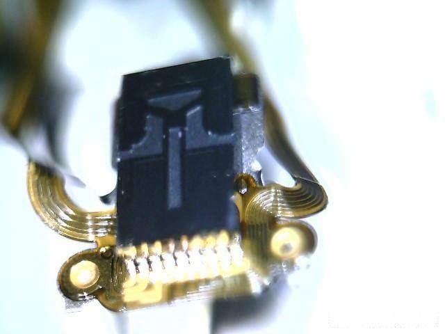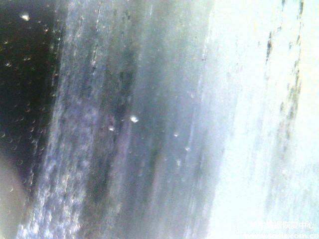 大家再看下图,下图是硬盘的磁头在显微镜下的表现状态,靠右下有污损说明这层盘片是有问题的。