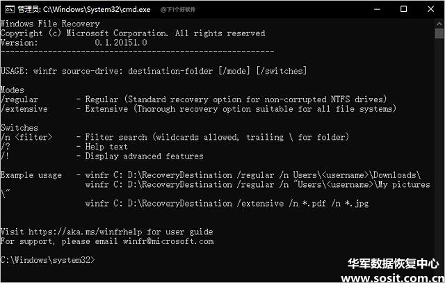 微软生产的免费数据恢复软件WindowsFileRecovery,需要Win102004版以上才能使用,功能支持NTFS,FAT,exFAT,ReFS系统文件可根据关键词、文件路径、文件名称、扩展名进行恢复;支持三种恢复模式:普通模式、分段模式(segmentmode),签名方式(signaturemode),三种方法对应不同的恢复文件场景需求。